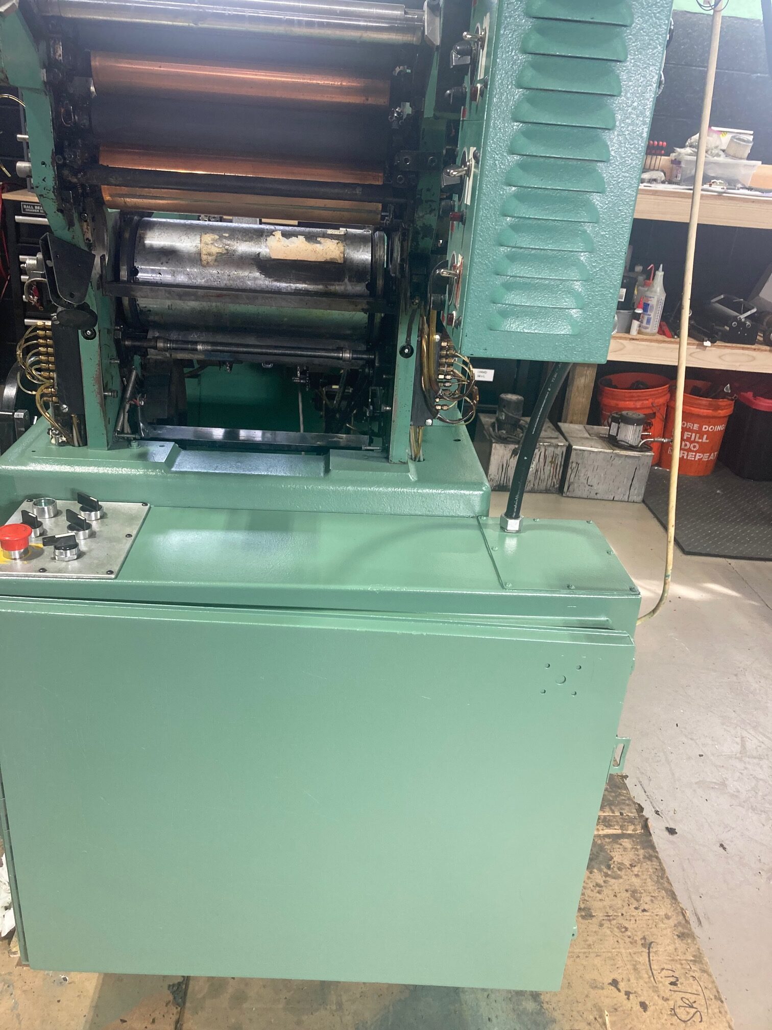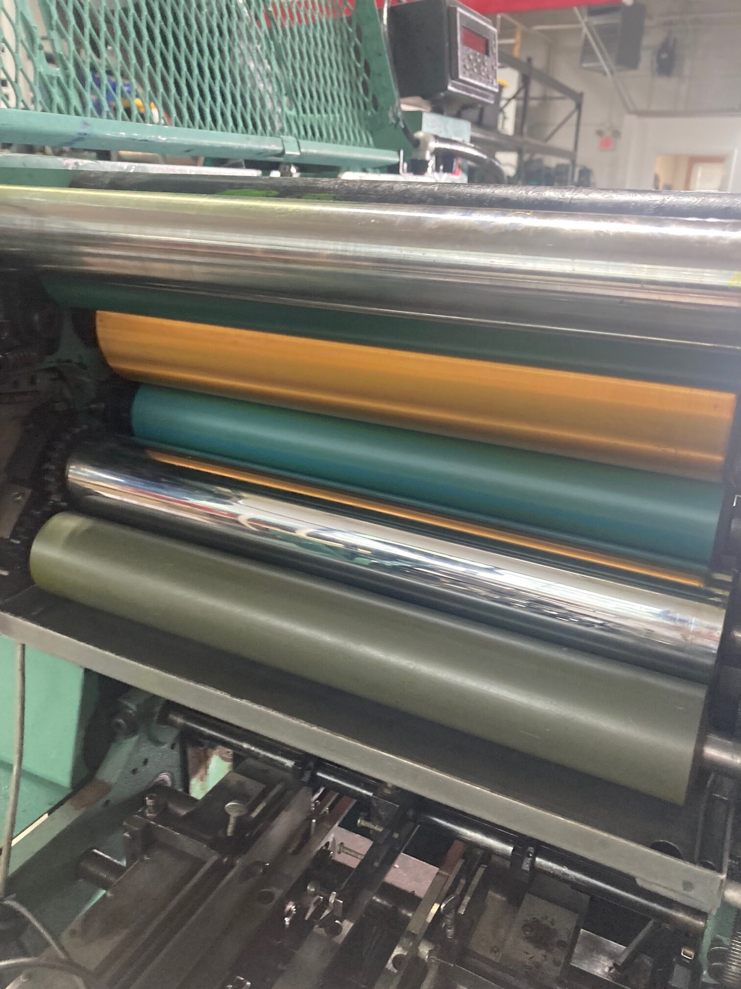 HALM JET PRESS 3 inch 2 color perfector machine with top and bottom feeders, model JP-TWOD-PD serial number 804RM. Machine serviced in April 2025, cleaned with brand new sets of rollers / bearings on both print heads, brand new plate cylinder shafts and bearings